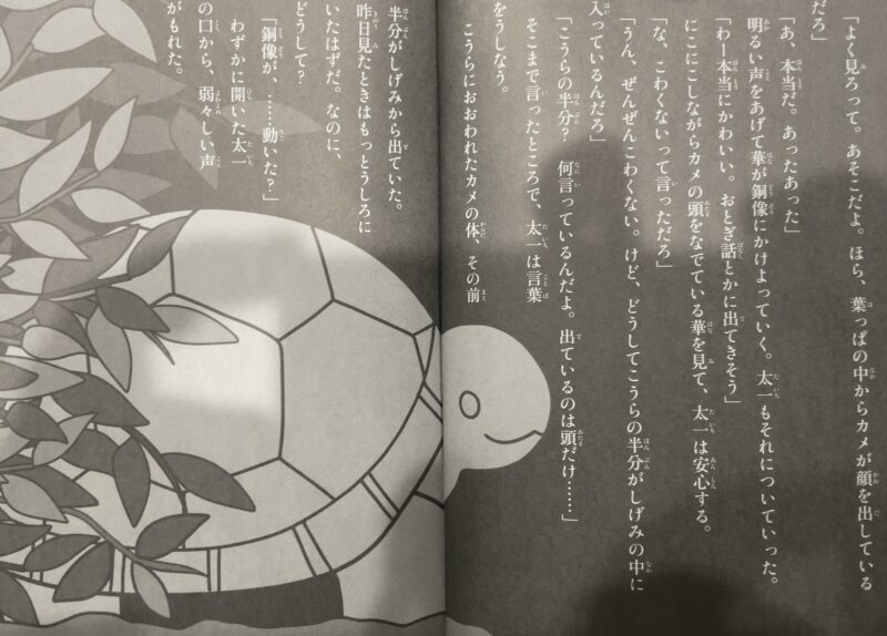 ある春の日、校庭のすみにあるカメの銅像が動いていた。