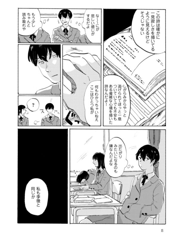作品の中では、谷川俊太郎の『生きる』も描かれていたり、